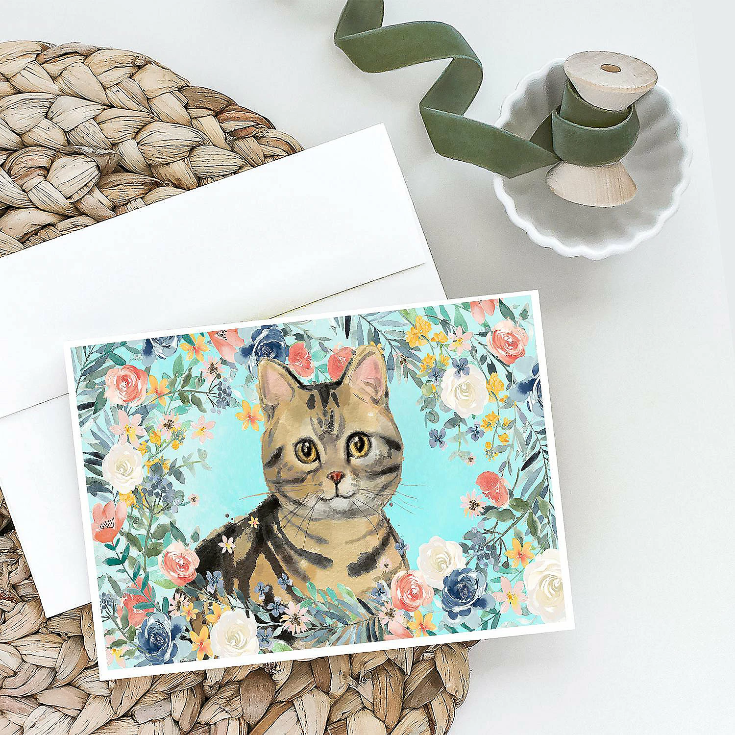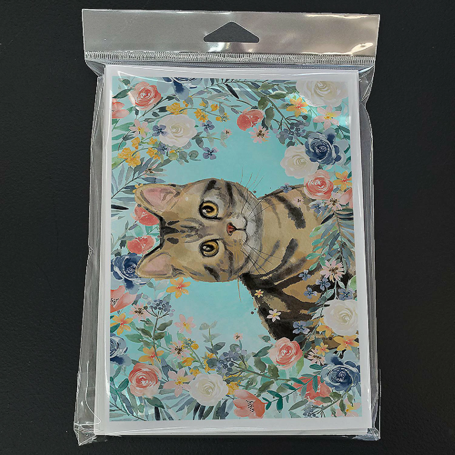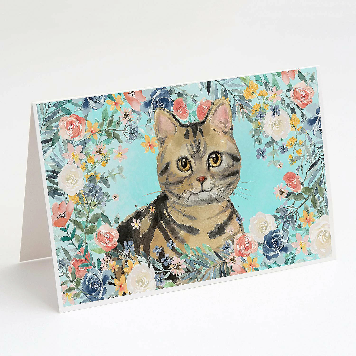 American Shorthair Brown Tabby Spring Flowers Greeting Cards and Envelopes Pack of 8. Greeting Cards and Envelopes Pack of 8 featuring breed specific American Shorthair artwork. Caroline’s Treasures Printed Greeting card Pack. This is a pack of eight folded 5×7 cards and eight matching white envelopes. These cards are blank inside for you to add your special note or special holiday greeting. The full color artwork cards are printed in our facility in full color on our 80 lb cover stock or 216 GSM. The super smooth finish of the white cards really enhance the artwork on the card. Each card comes with a matching white envelope. The artwork on the card was created by one of our in house creative artist or one of our licensed artists. This is from Caroline’s Treasures Cats category of products.