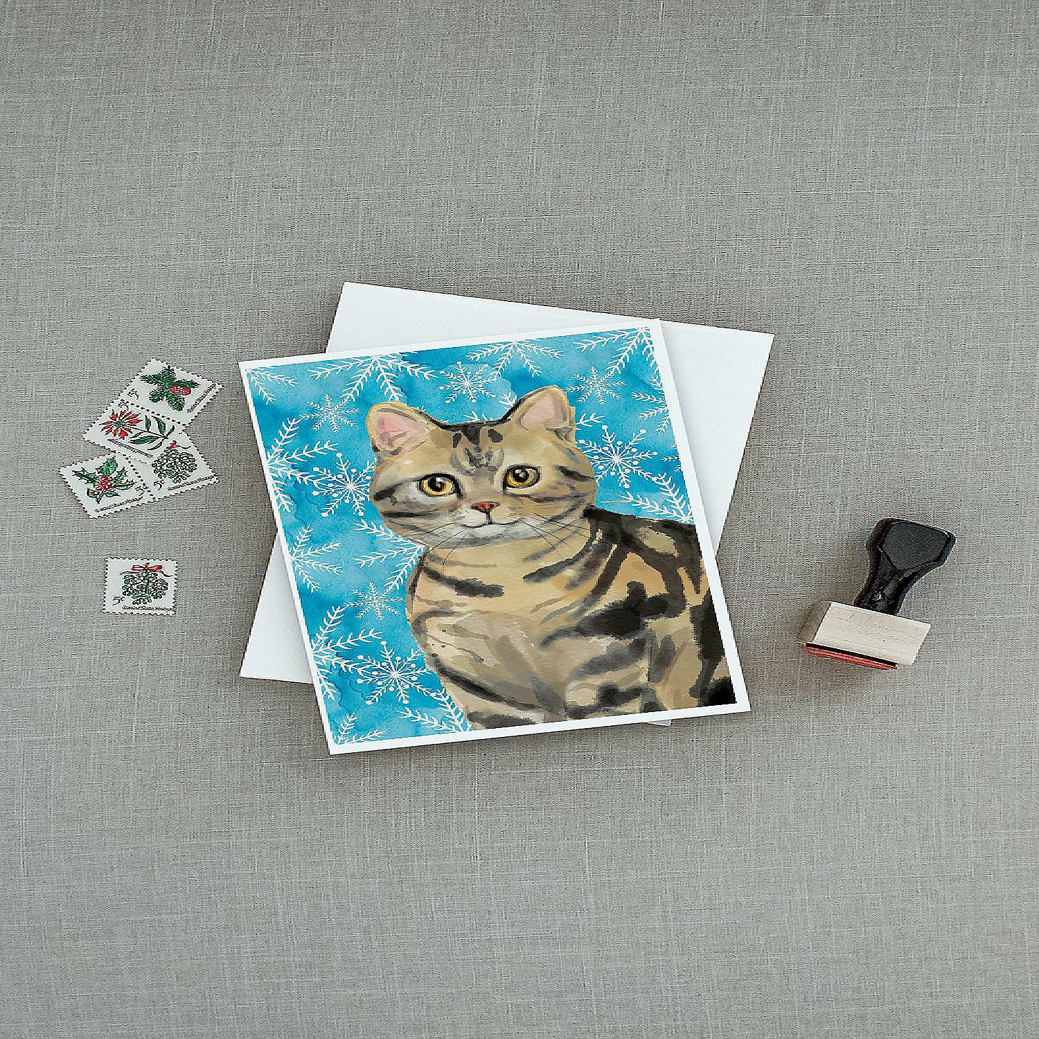 American Shorthair Brown Tabby Winter Snowflakes Greeting Cards and Envelopes Pack of 8. Greeting Cards and Envelopes Pack of 8 featuring breed specific American Shorthair artwork. Caroline’s Treasures Printed Greeting card Pack. This is a pack of eight folded 5×7 cards and eight matching white envelopes. These cards are blank inside for you to add your special note or special holiday greeting. The full color artwork cards are printed in our facility in full color on our 80 lb cover stock or 216 GSM. The super smooth finish of the white cards really enhance the artwork on the card. Each card comes with a matching white envelope. The artwork on the card was created by one of our in house creative artist or one of our licensed artists. This is from Caroline’s Treasures Cats category of products.
