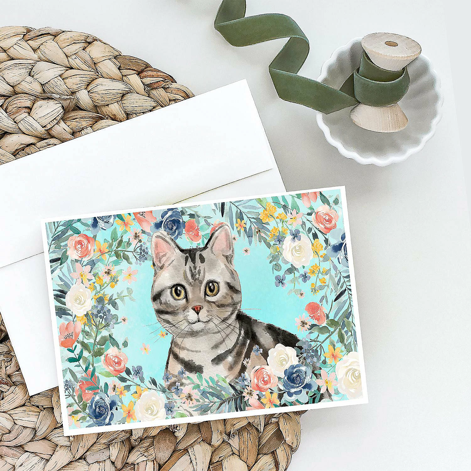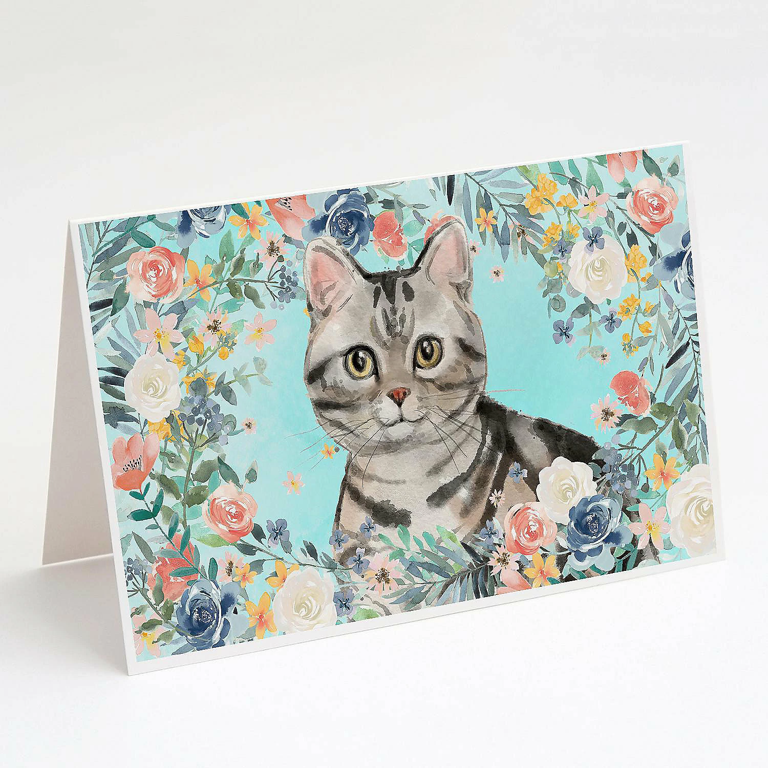 American Shorthair Spring Flowers Greeting Cards and Envelopes Pack of 8. Greeting Cards and Envelopes Pack of 8 featuring breed specific American Shorthair artwork. Caroline’s Treasures Printed Greeting card Pack. This is a pack of eight folded 5×7 cards and eight matching white envelopes. These cards are blank inside for you to add your special note or special holiday greeting. The full color artwork cards are printed in our facility in full color on our 80 lb cover stock or 216 GSM. The super smooth finish of the white cards really enhance the artwork on the card. Each card comes with a matching white envelope. The artwork on the card was created by one of our in house creative artist or one of our licensed artists. This is from Caroline’s Treasures Cats category of products.
