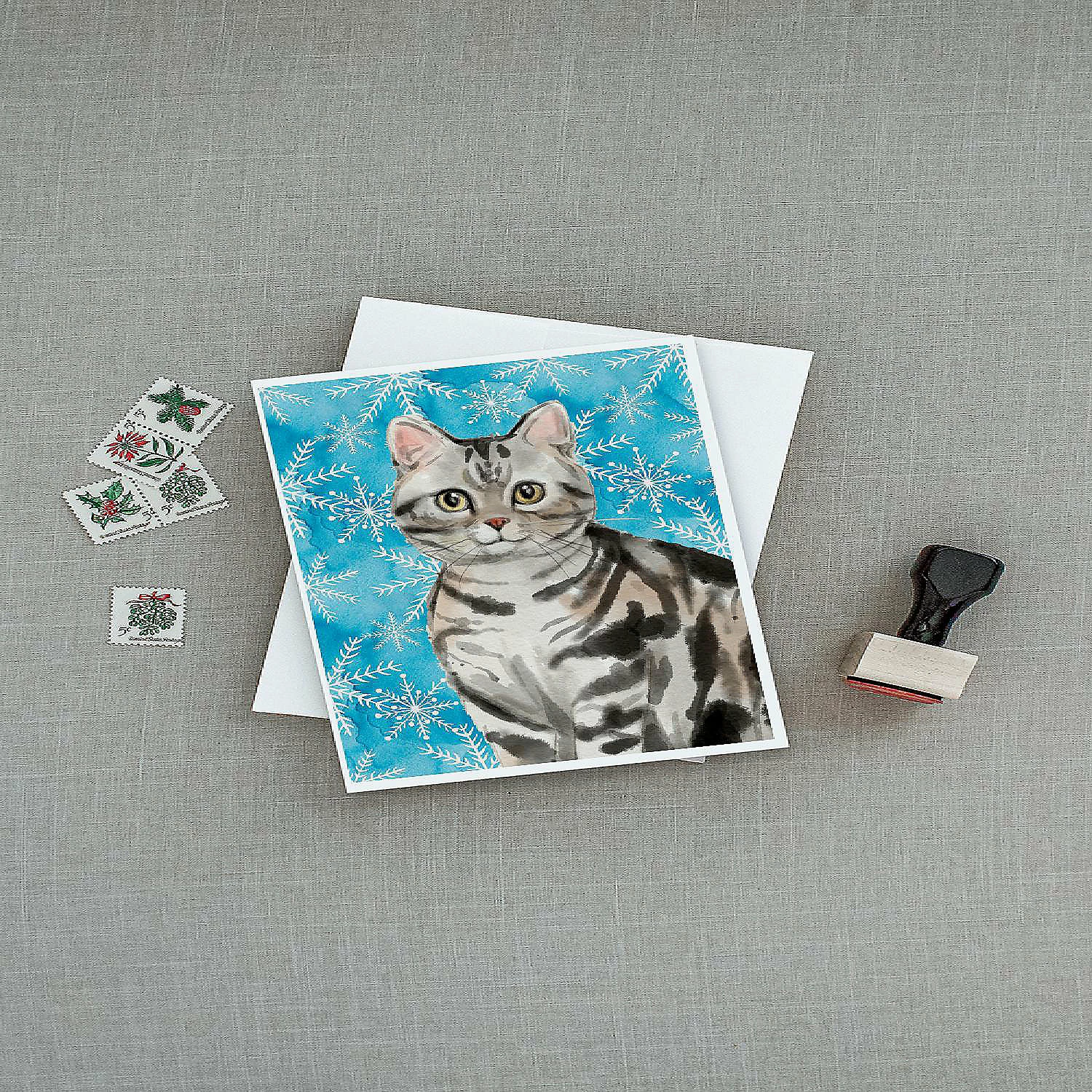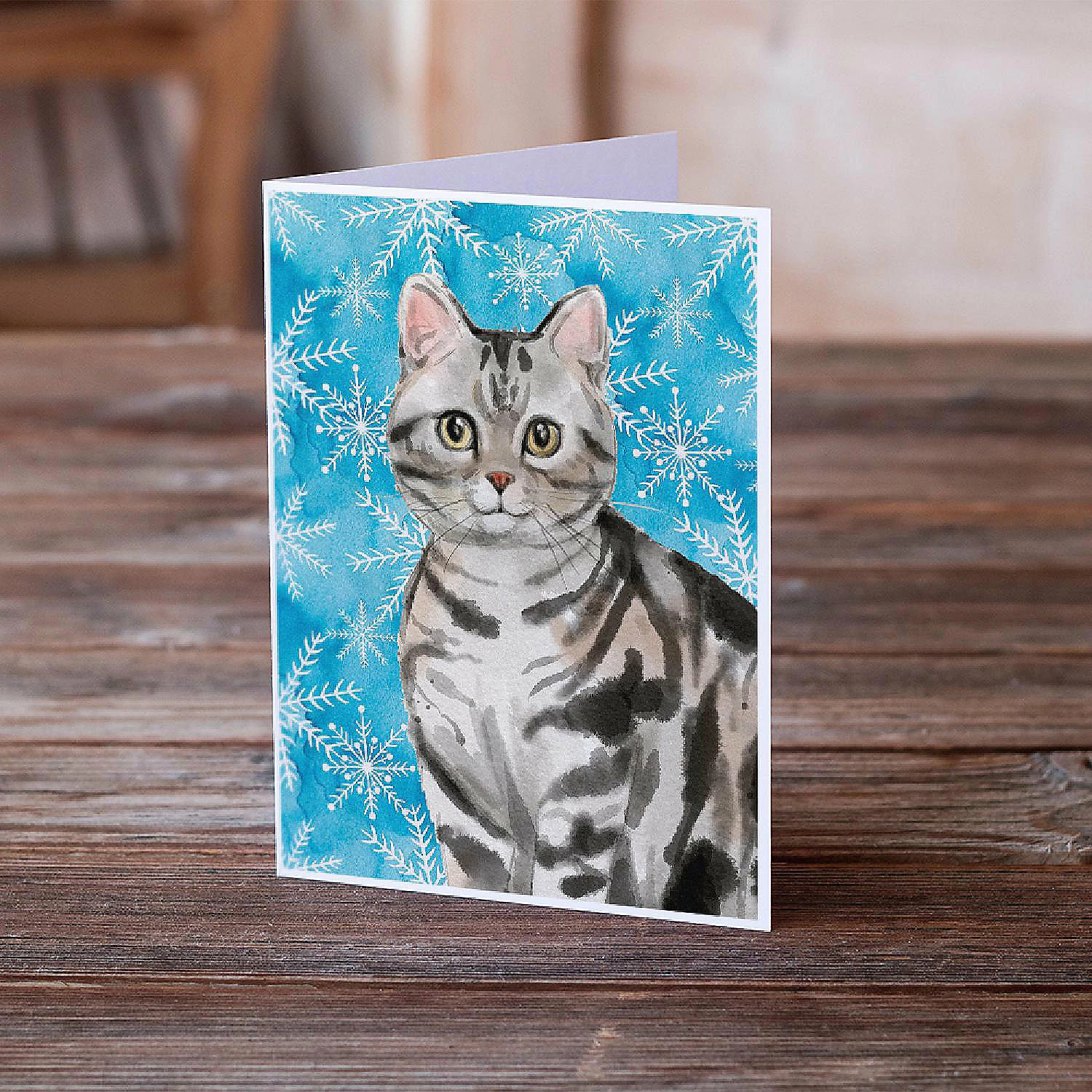 American Shorthair Winter Snowflakes Greeting Cards and Envelopes Pack of 8. Greeting Cards and Envelopes Pack of 8 featuring breed specific American Shorthair artwork. Caroline’s Treasures Printed Greeting card Pack. This is a pack of eight folded 5×7 cards and eight matching white envelopes. These cards are blank inside for you to add your special note or special holiday greeting. The full color artwork cards are printed in our facility in full color on our 80 lb cover stock or 216 GSM. The super smooth finish of the white cards really enhance the artwork on the card. Each card comes with a matching white envelope. The artwork on the card was created by one of our in house creative artist or one of our licensed artists. This is from Caroline’s Treasures Cats category of products.