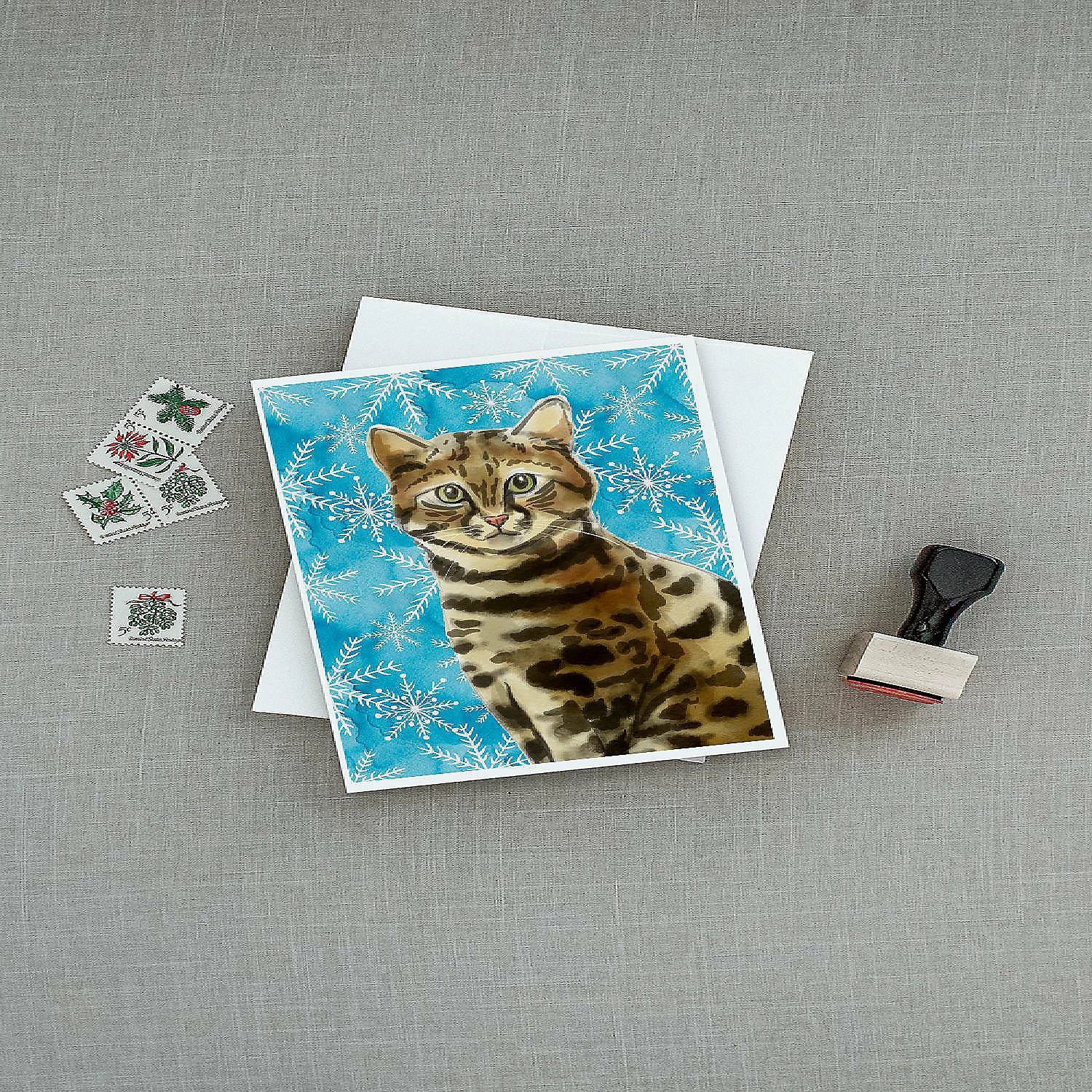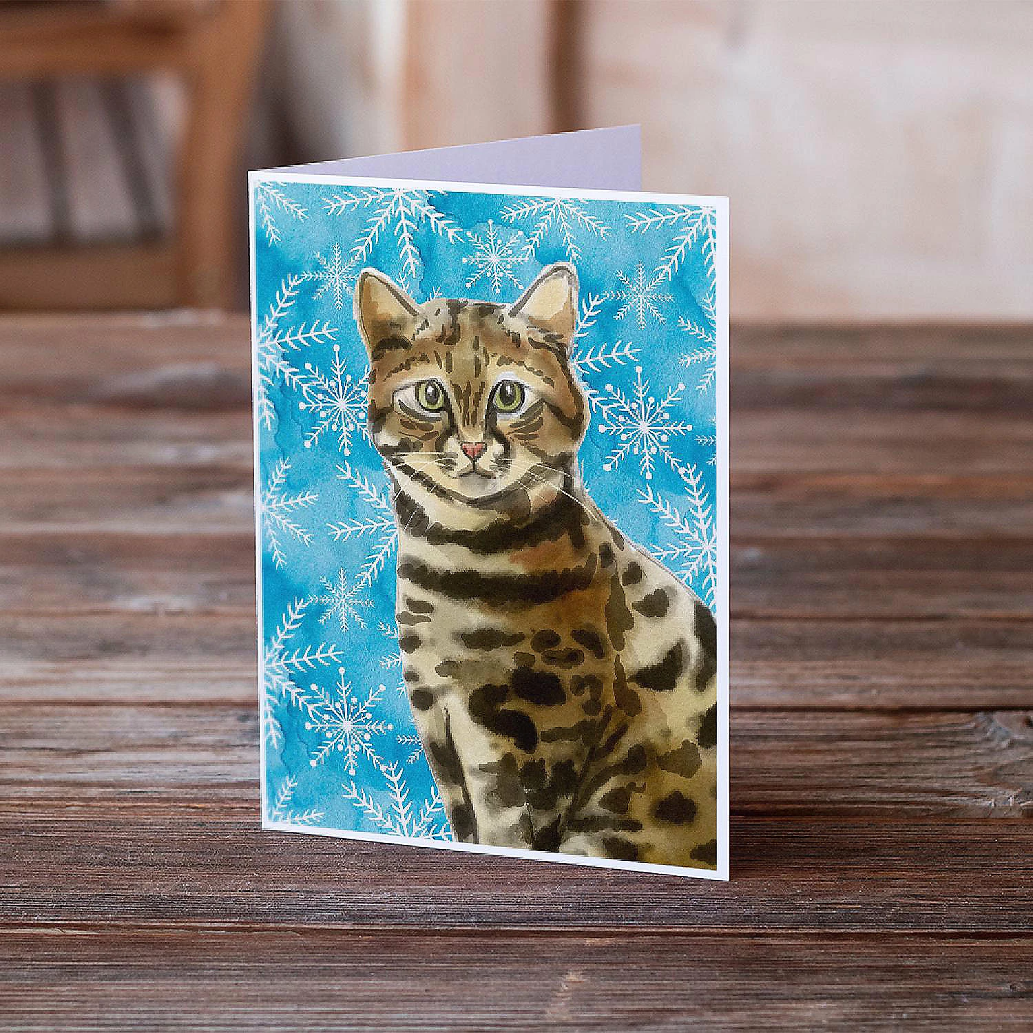 Bengal Winter Snowflakes Greeting Cards and Envelopes Pack of 8. Greeting Cards and Envelopes Pack of 8 featuring breed specific Bengal artwork. Caroline’s Treasures Printed Greeting card Pack. This is a pack of eight folded 5×7 cards and eight matching white envelopes. These cards are blank inside for you to add your special note or special holiday greeting. The full color artwork cards are printed in our facility in full color on our 80 lb cover stock or 216 GSM. The super smooth finish of the white cards really enhance the artwork on the card. Each card comes with a matching white envelope. The artwork on the card was created by one of our in house creative artist or one of our licensed artists. This is from Caroline’s Treasures Cats category of products.