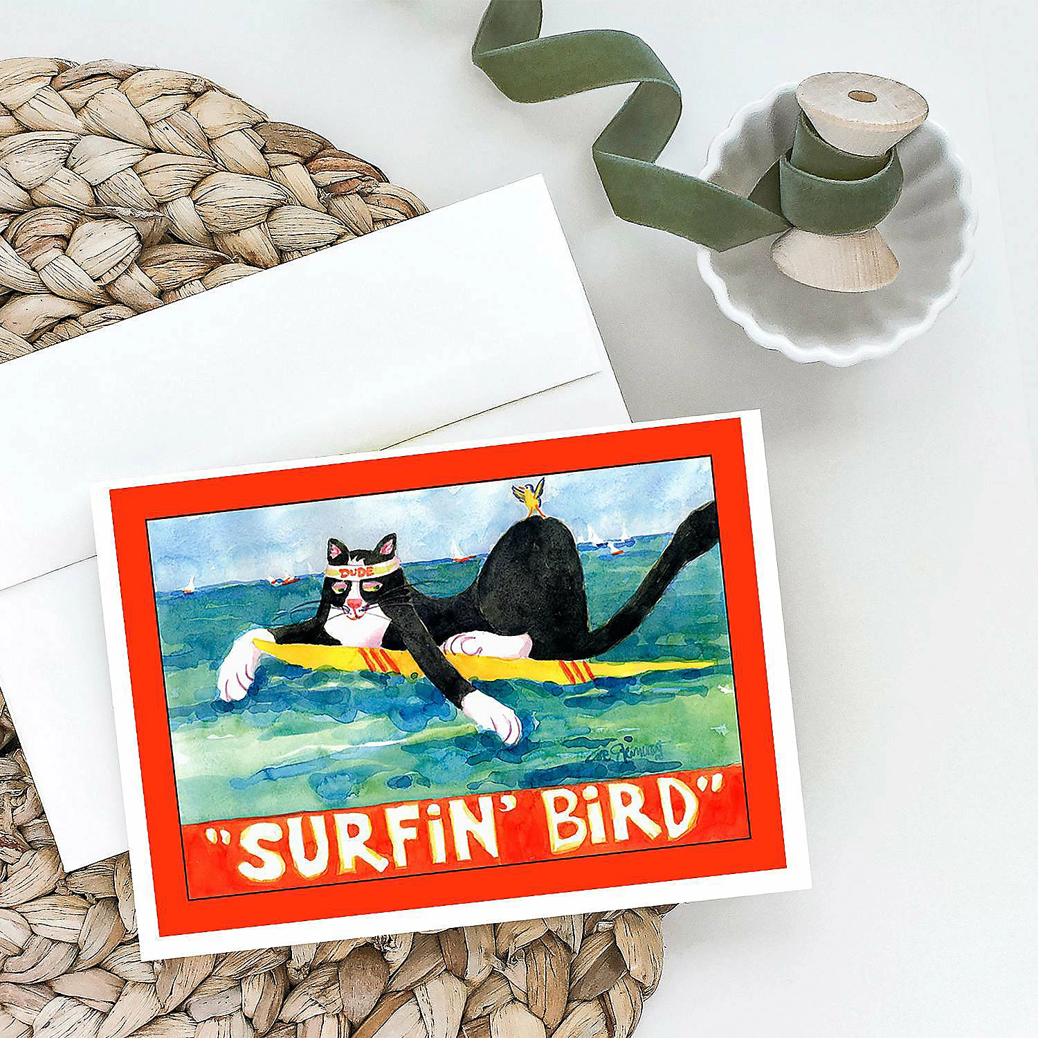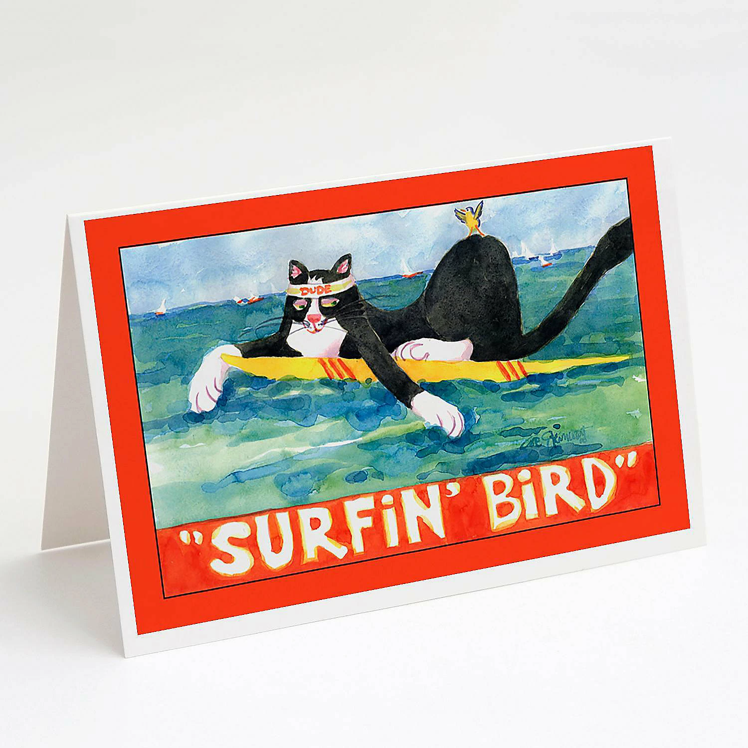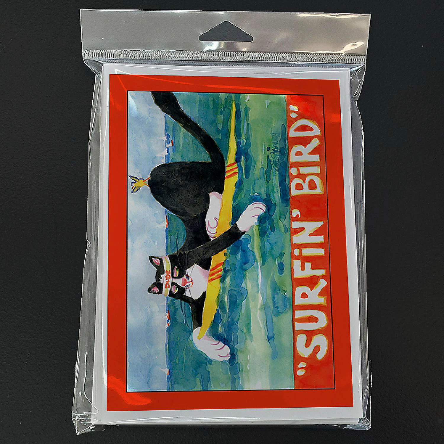 Black and white Cat Surfin Bird Greeting Cards and Envelopes Pack of 8. Caroline’s Treasures Printed Greeting card Pack. This is a pack of eight folded 5×7 cards and eight matching white envelopes. These cards are blank inside for you to add your special note or special holiday greeting. The full color artwork cards are printed in our facility in full color on our 80 lb cover stock or 216 GSM. The super smooth finish of the white cards really enhance the artwork on the card. Each card comes with a matching white envelope. The artwork on the card was created by one of our in house creative artist or one of our licensed artists. This is from Caroline’s Treasures Cats category of products.