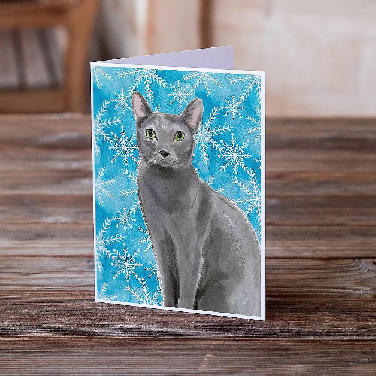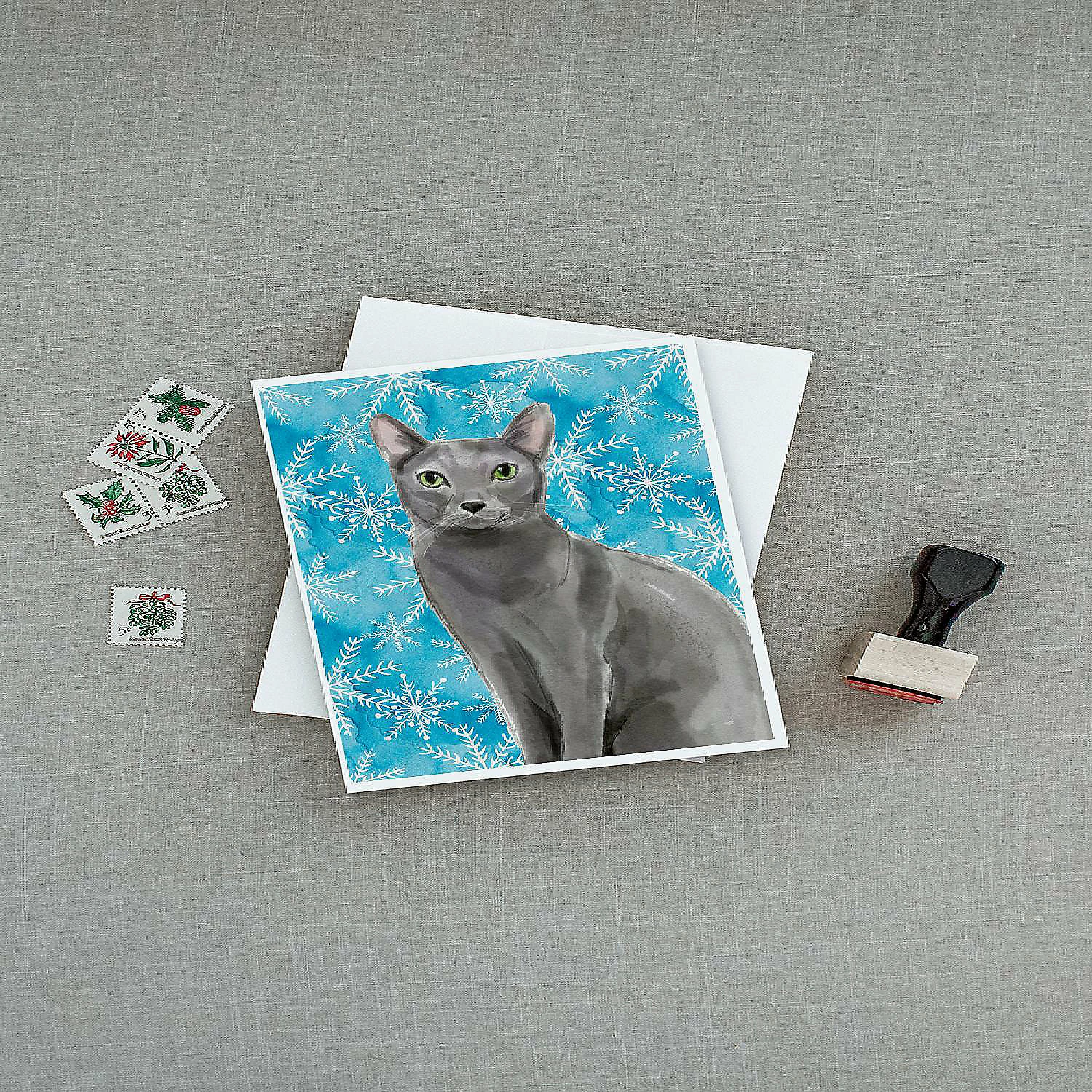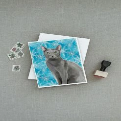 Blue Russian Winter Snowflakes Greeting Cards and Envelopes Pack of 8. Greeting Cards and Envelopes Pack of 8 featuring breed specific Blue Russian artwork. Caroline’s Treasures Printed Greeting card Pack. This is a pack of eight folded 5×7 cards and eight matching white envelopes. These cards are blank inside for you to add your special note or special holiday greeting. The full color artwork cards are printed in our facility in full color on our 80 lb cover stock or 216 GSM. The super smooth finish of the white cards really enhance the artwork on the card. Each card comes with a matching white envelope. The artwork on the card was created by one of our in house creative artist or one of our licensed artists. This is from Caroline’s Treasures Cats category of products.