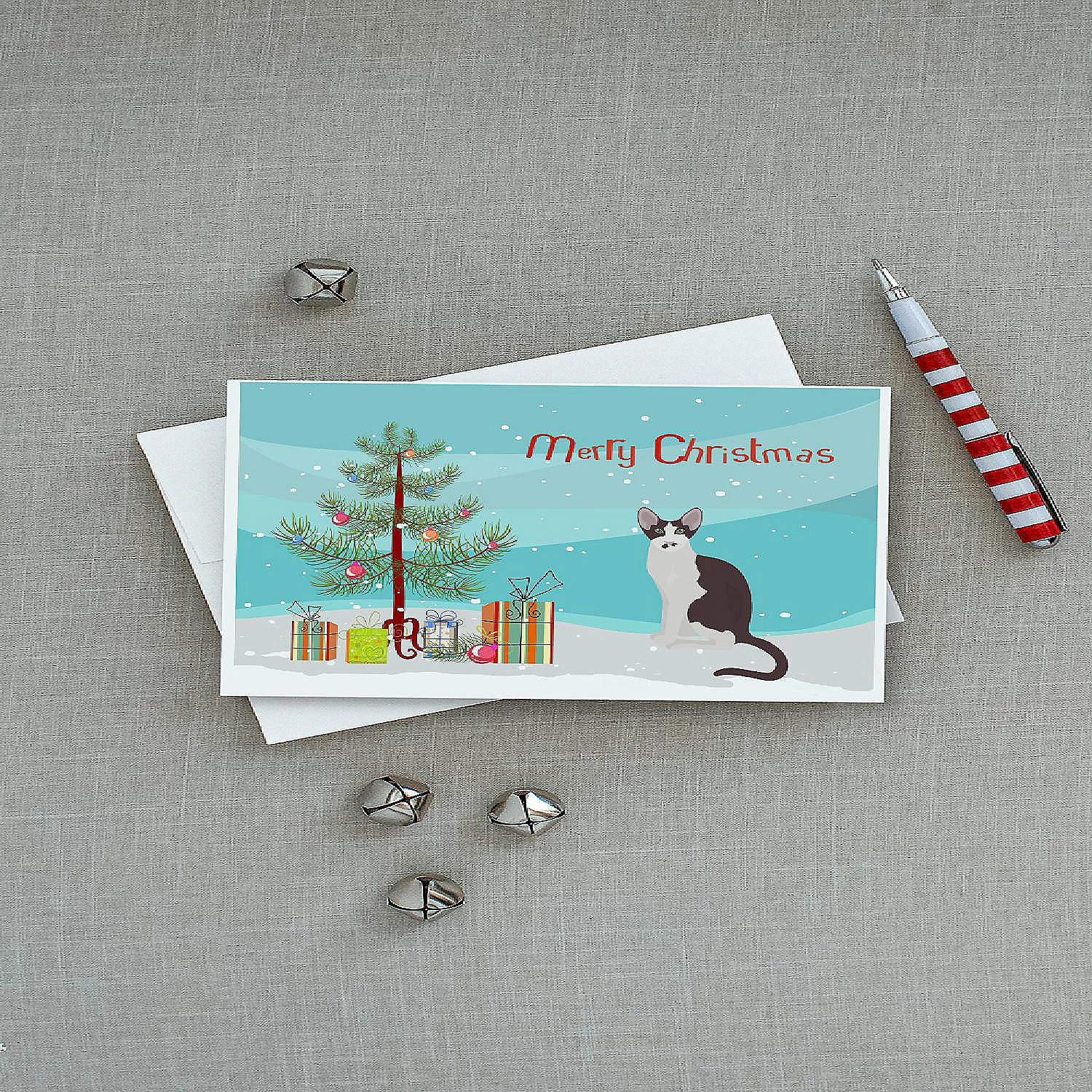 Oriental Bicolor Cat Merry Christmas Greeting Cards and Envelopes Pack of 8. Greeting Cards and Envelopes Pack of 8 featuring breed specific Oriental Bicolor artwork. Celebrate Christmas with this Christmas . Caroline’s Treasures Printed Greeting card Pack. This is a pack of eight folded 5×7 cards and eight matching white envelopes. These cards are blank inside for you to add your special note or special holiday greeting. The full color artwork cards are printed in our facility in full color on our 80 lb cover stock or 216 GSM. The super smooth finish of the white cards really enhance the artwork on the card. Each card comes with a matching white envelope. The artwork on the card was created by one of our in house creative artist or one of our licensed artists. This is from Caroline’s Treasures Cats category of products.