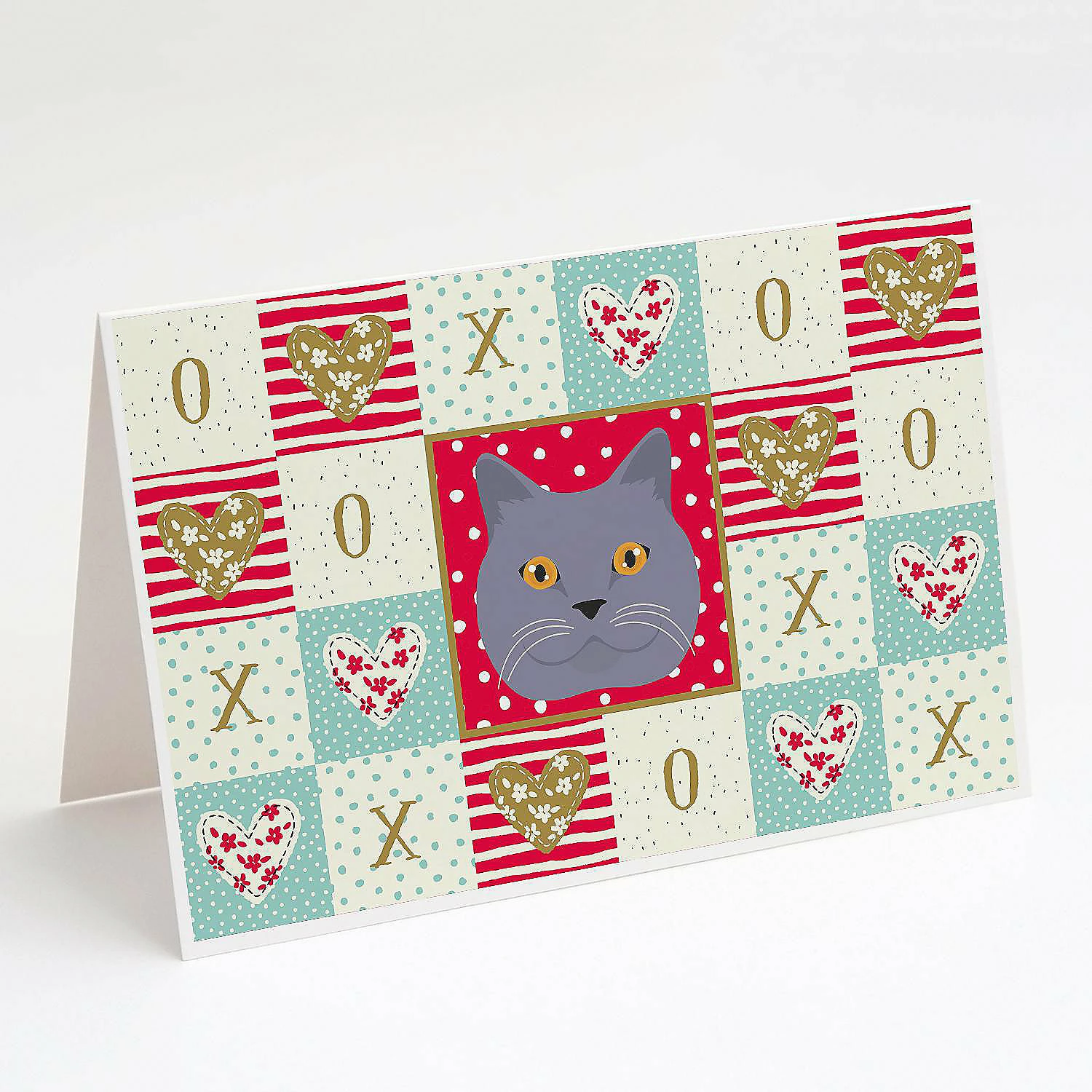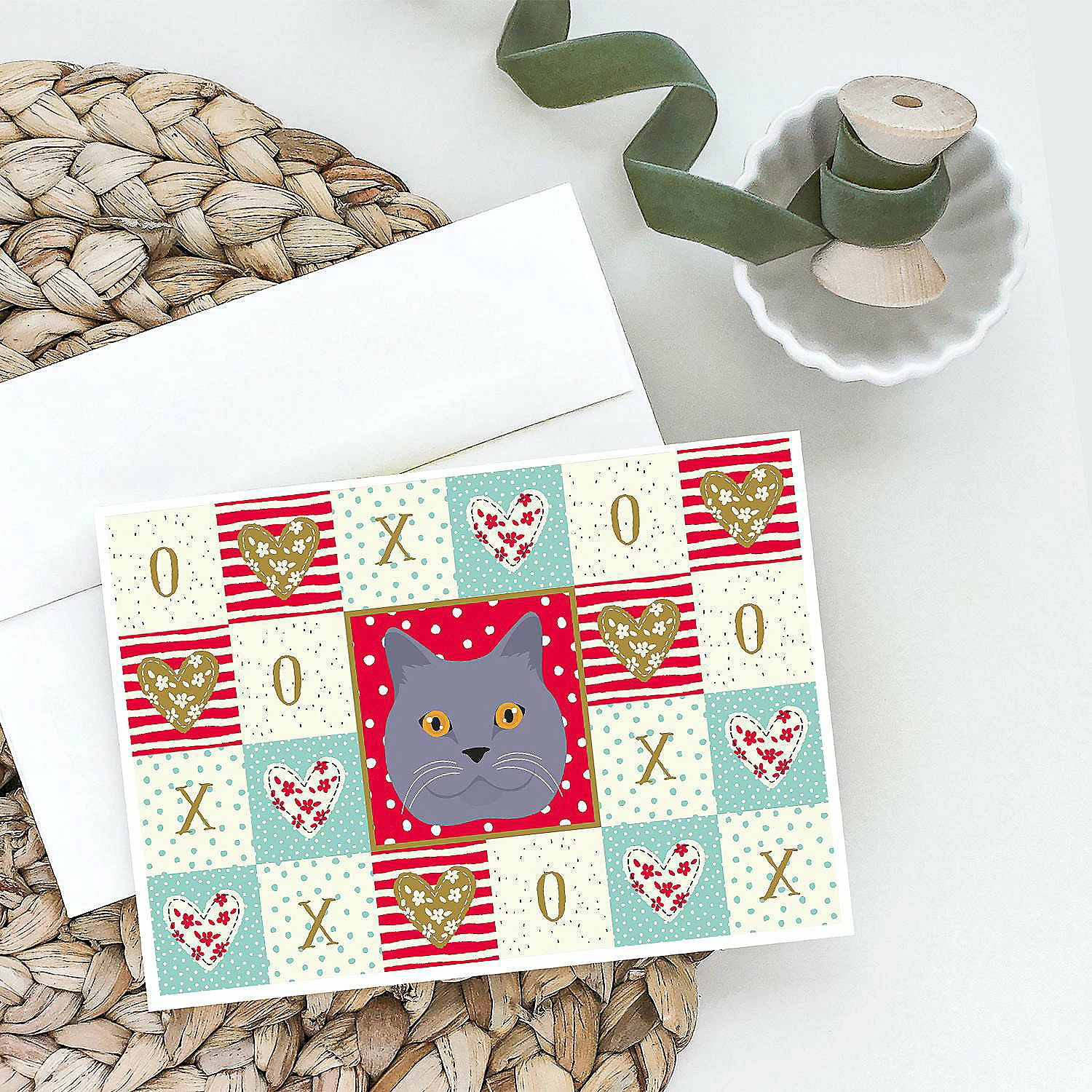 British Shorthair Cat Love Greeting Cards and Envelopes Pack of 8. Greeting Cards and Envelopes Pack of 8 featuring breed specific British Shorthair artwork. Celebrate Valentine’s Day with this Valentine’s Day . Caroline’s Treasures Printed Greeting card Pack. This is a pack of eight folded 5×7 cards and eight matching white envelopes. These cards are blank inside for you to add your special note or special holiday greeting. The full color artwork cards are printed in our facility in full color on our 80 lb cover stock or 216 GSM. The super smooth finish of the white cards really enhance the artwork on the card. Each card comes with a matching white envelope. The artwork on the card was created by one of our in house creative artist or one of our licensed artists. This is from Caroline’s Treasures Cats category of products.