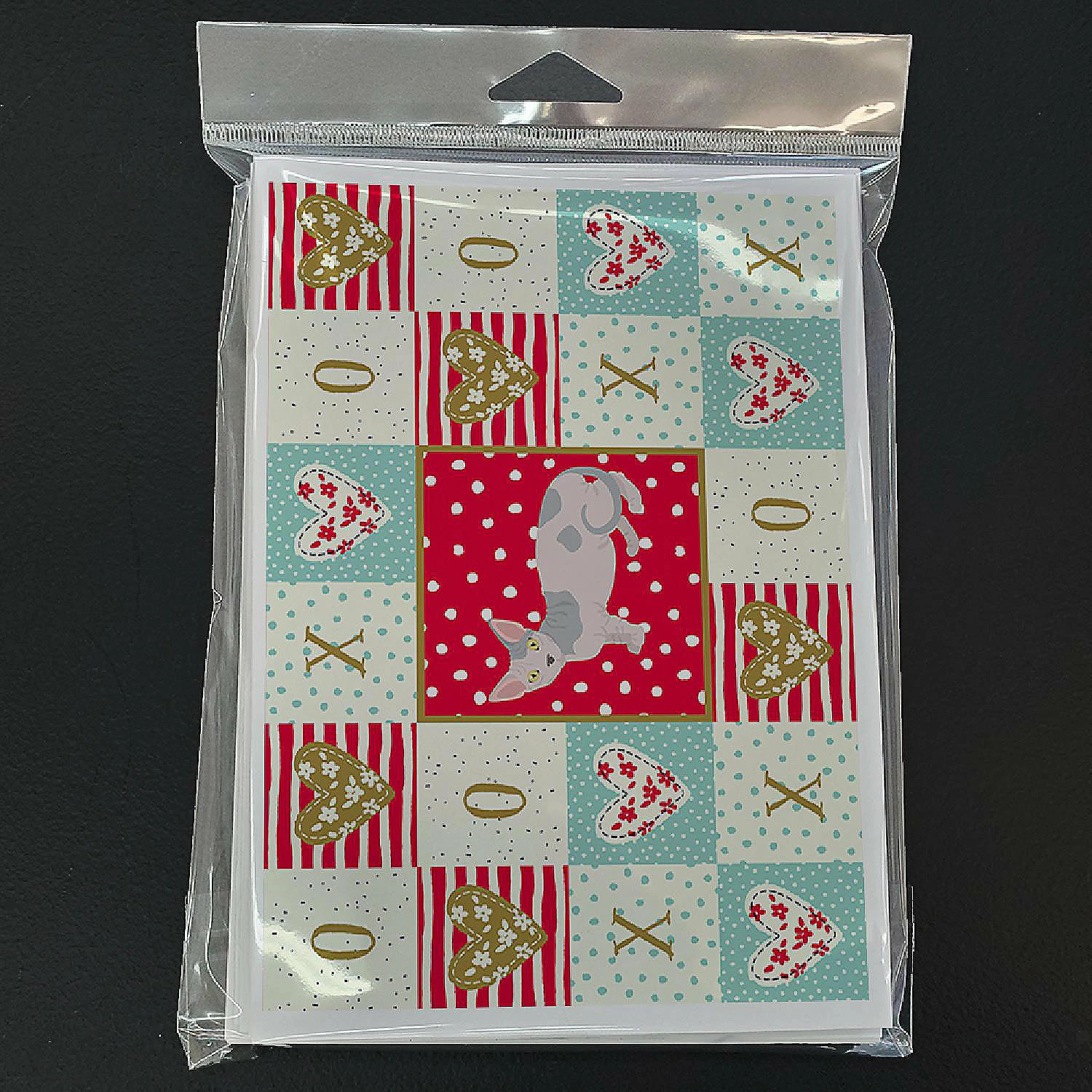 Minskin Cat Love Greeting Cards and Envelopes Pack of 8. Greeting Cards and Envelopes Pack of 8 featuring breed specific Minskin artwork. Celebrate Valentine’s Day with this Valentine’s Day . Caroline’s Treasures Printed Greeting card Pack. This is a pack of eight folded 5×7 cards and eight matching white envelopes. These cards are blank inside for you to add your special note or special holiday greeting. The full color artwork cards are printed in our facility in full color on our 80 lb cover stock or 216 GSM. The super smooth finish of the white cards really enhance the artwork on the card. Each card comes with a matching white envelope. The artwork on the card was created by one of our in house creative artist or one of our licensed artists. This is from Caroline’s Treasures Cats category of products.