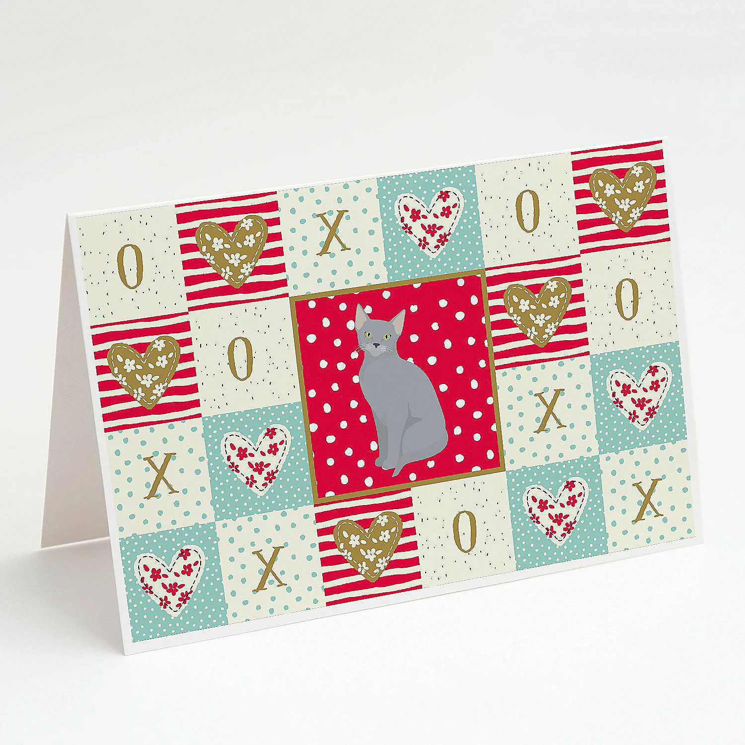 Russian Blue Cat Love Greeting Cards and Envelopes Pack of 8. Greeting Cards and Envelopes Pack of 8 featuring breed specific Russian Blue artwork. Celebrate Valentine’s Day with this Valentine’s Day . Caroline’s Treasures Printed Greeting card Pack. This is a pack of eight folded 5×7 cards and eight matching white envelopes. These cards are blank inside for you to add your special note or special holiday greeting. The full color artwork cards are printed in our facility in full color on our 80 lb cover stock or 216 GSM. The super smooth finish of the white cards really enhance the artwork on the card. Each card comes with a matching white envelope. The artwork on the card was created by one of our in house creative artist or one of our licensed artists. This is from Caroline’s Treasures Cats category of products.