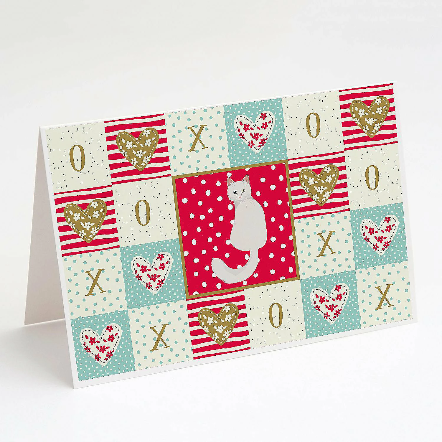 Turkish Angora Cat Love Greeting Cards and Envelopes Pack of 8. Greeting Cards and Envelopes Pack of 8 featuring breed specific Turkish Angora artwork. Celebrate Valentine’s Day with this Valentine’s Day . Caroline’s Treasures Printed Greeting card Pack. This is a pack of eight folded 5×7 cards and eight matching white envelopes. These cards are blank inside for you to add your special note or special holiday greeting. The full color artwork cards are printed in our facility in full color on our 80 lb cover stock or 216 GSM. The super smooth finish of the white cards really enhance the artwork on the card. Each card comes with a matching white envelope. The artwork on the card was created by one of our in house creative artist or one of our licensed artists. This is from Caroline’s Treasures Cats category of products.