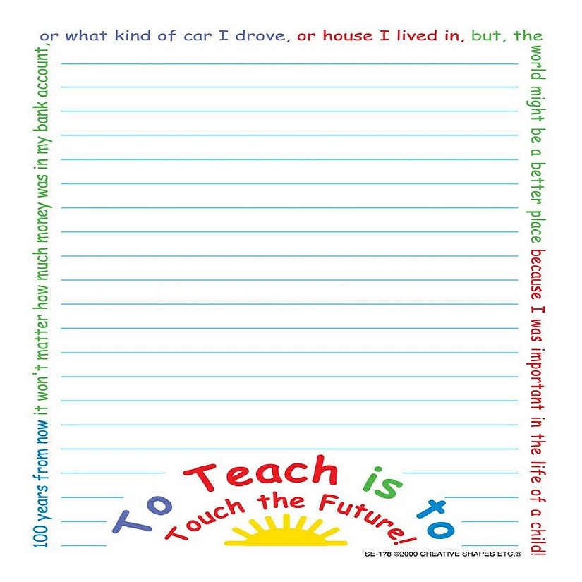 Our Touch the Future Lined Notepad has 50 sheets per package and is approx. 5″ x 7.” It is great for making word cards, shaped books, game parts, scrapbooks and much more. ACID FREE!