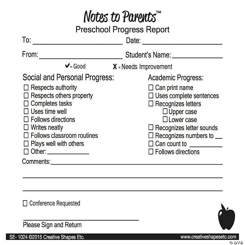 MADE IN USA: Preschool Progress Report – Notes to Parents come with 50 two-part carbon-less forms in a package, measure 4.25โ x 5.5โ and are made in the USA.