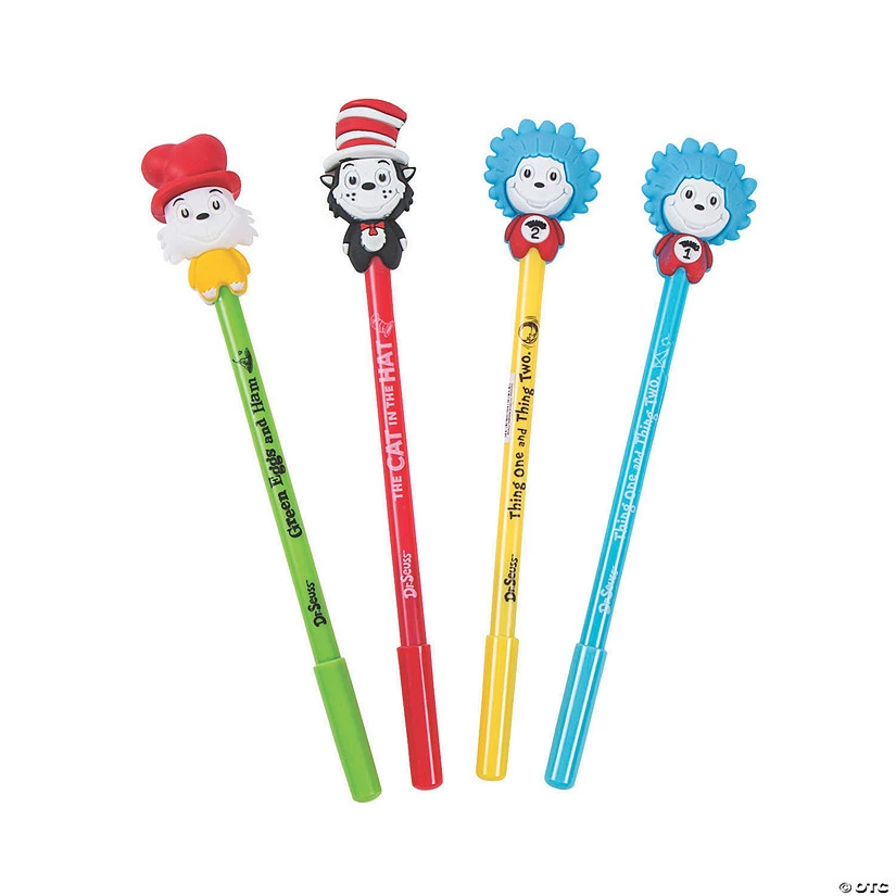 Inspire learning and creative thinking with these fun and bright Dr. Seuss™ pens! Each colorful pen features a 3D topper of one of Dr. Seuss’ characters. Add them to party favor bags or classroom reward bins! Includes 4 different designs, including: Thing 1, Thing 2, The Cat in the Hat and Sam I Am. ™ & © 2019 Dr. Seuss Enterprises L.P. All Rights Reserved.