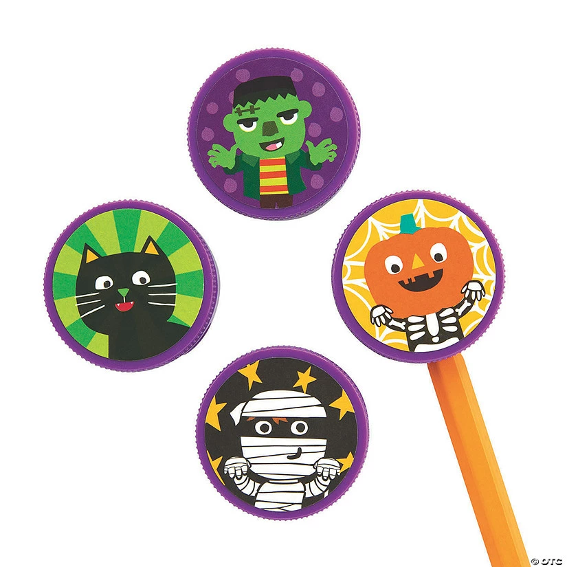 Keep things sharp this Halloween with these cute pencil sharpeners! Each sharpener features not-so-scary Halloween images and fun Halloween colors. Great as Halloween classroom rewards or party favors, kids will love these sharpeners that put the fun in functional! Hand these out to trick-or-treaters instead of giving them candy. Plastic. 1 1/4″
