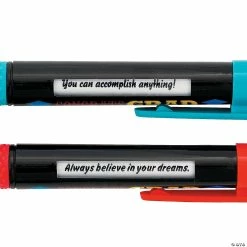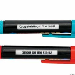 Donโt let any of your graduation party guests leave without these mementos of your graduation party. These black ink Grad Message Pens feature one of six motivational or rewarding messages with each click: “Shoot for the stars!”, “Keep chasing your goals.”, “You can accomplish anything!”, “Good Luck!”, “Always believe in your dreams.” and “Congratulations! You did it!”. Add these to your graduation party favors today! Plastic. 5 1/4″ ยฉ OTC