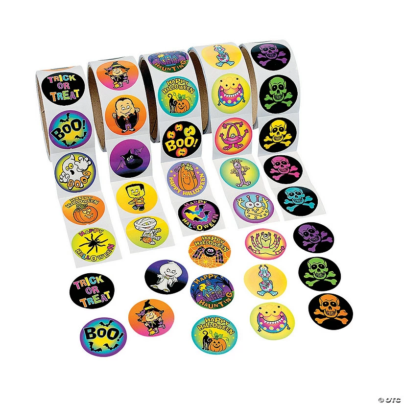 500 Pc. Halloween Sticker Assortment. This assortment includes plenty of perforated stickers for Halloween fun! Ideal for trick-or-treaters and classroom parties, these stickers look great on goody bags. Includes spiders, ghosts, skull and crossbones and a variety of colorful Halloween designs. Paper. (100 stickers per roll, 5 rolls per unit) 1 1/2″ Perforated for easy handouts. © OTC