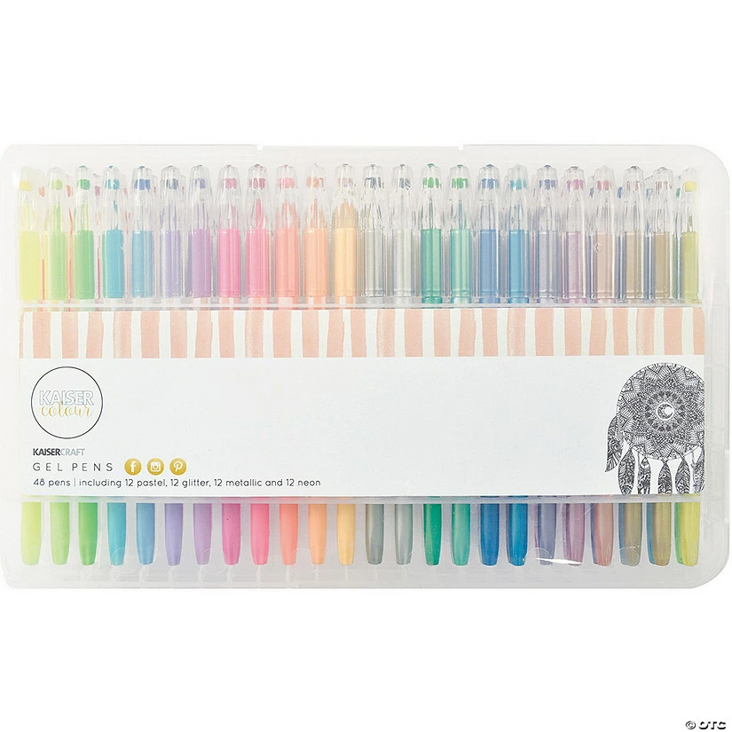 Kaisercraft-KaiserColour Gel Pens: Pastel, Glitter, Metallic And Neon. These gel pens are great for card making and scrapbook journaling but also a must have for home, office, school and adult coloring books! This package contains twelve pastel gel pens, twelve glitter gel pens, twelve metallic gel pens and twelve neon gel pens in assorted colors within one 6-3/4x11x1 inch plastic case. Conforms to ASTM D 4236. Imported.