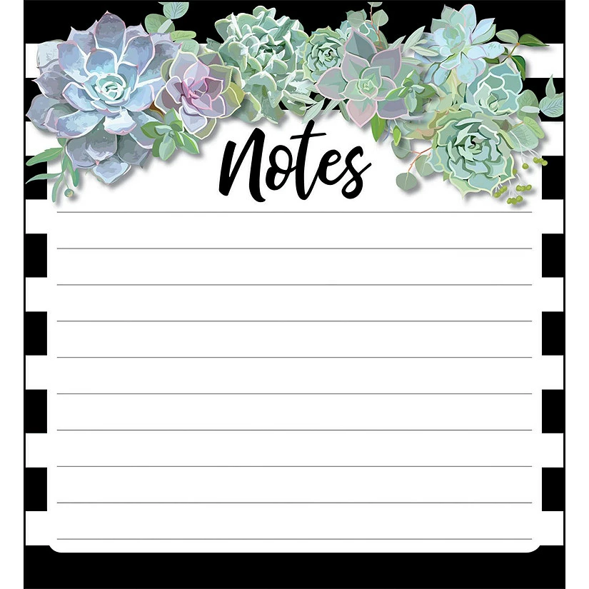 WHATโS INCLUDED: The note pad boasts 50 acid-free and lignin-free sheets that tear off with ease each time you grab a piece of paper. The lined pad includes a “notes” header in cursive with colorful succulents on a black and white stripe background.