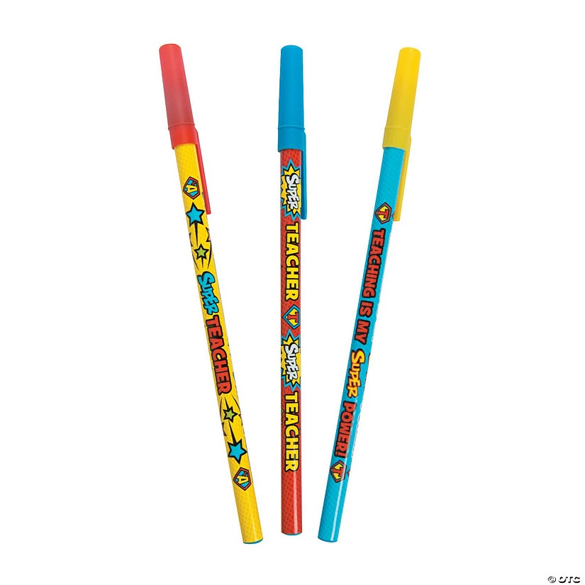 These pens are school supplies that will get your year off to a super start! Use them to grade star papers and A+ tests or hand out as classroom awards. Each stick pen is printed in a superhero theme and will get your students feeling invincible! Black ink. Plastic. (2 dozen per unit) 7″