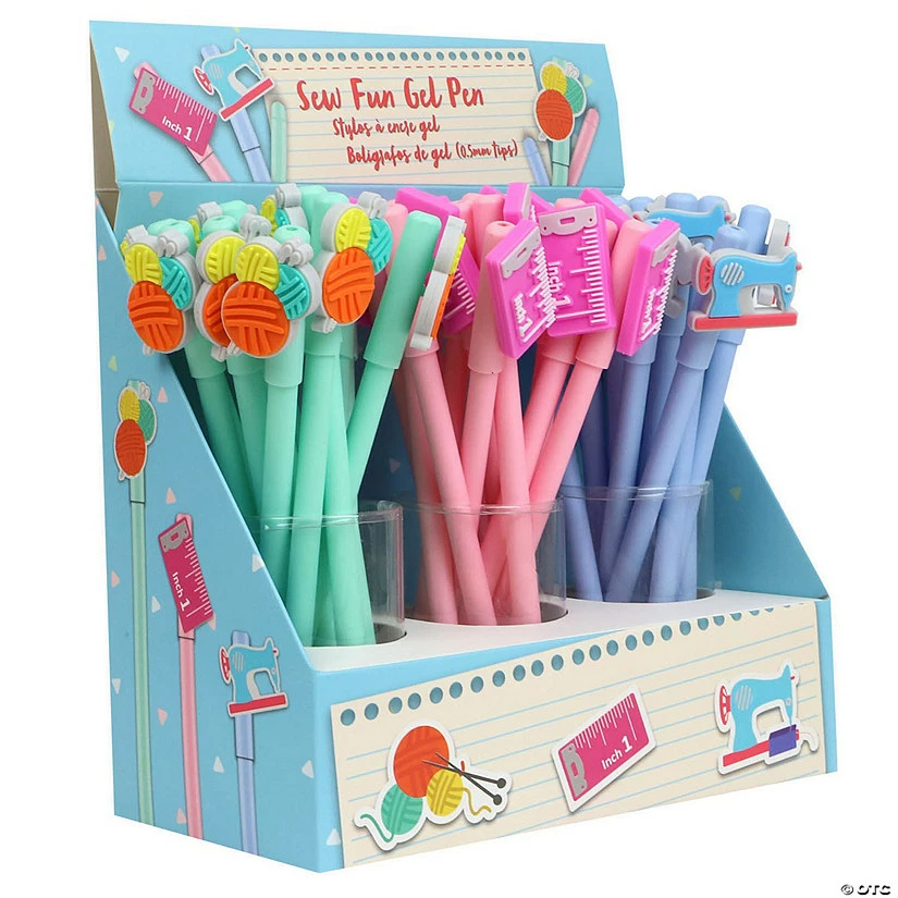 Tacony Sew Tasty Sew Fun Gel Pen POP 36pc- Gel pen with black ink. Three cap designs include: mint green with 3 balls of yarn and knitting needles, light pink with pink tape measure, and light blue with a blue and red sewing machine. Pen measures approximately 6.75″ long. Display measures approximately 7.63x 6.88″x 3.75″ with 3 clear containers to display pens.. Special Shipping Information: This item ships separately from other items in your order. This item cannot ship to a P.O. Box. This item may be subject to additional processing days. Item is not eligible for expedited shipping. You may initiate a return for unused items within 30 days, if the items are in original packaging with all original materials included with the shipment.